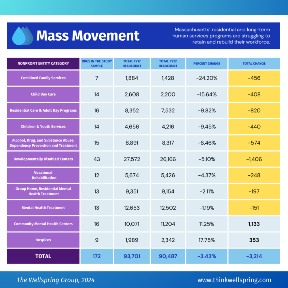 Our team recently completed a study of 172 Massachusetts human services organizations with more than 50 employees (which yielded a talent pool of over 90,000 Massachusetts human services employees) from FY2017 to FY2022.